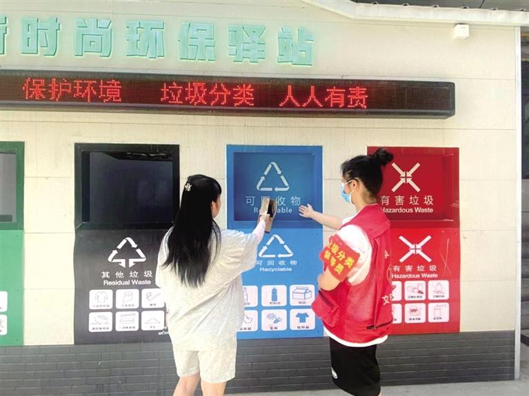 记者看到一所白色的小屋内,四色垃圾桶的标识明显。小屋上方写着“新时尚环保驿站”。在小屋的一侧,还设有洗手台,方便居民投放后清洁双手。杨家园社区副主任张欢欢说,新时尚环保驿站实现从“分类桶”到“智能分类房”的转变升级,既美化了环境,又提高了投放准确率。驿站内设照明灯、换气扇、紫外线消杀灯、可回收物放置区、垃圾桶堆放区等。此外,垃圾分类督导员每天定时进行清洗、消毒,并指导居民准确投放生活垃圾。