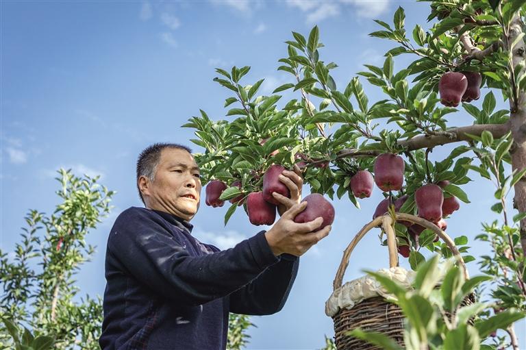 “截至目前,我们村种植苹果1500多亩,其中蛇果1000亩,红富士500亩。最近采摘的主要是蛇果,从9月下旬开始集中采摘,由三个合作社负责,每天能采收近15万斤,预计总产量在200多万斤。红富士苹果正在取袋,预计产量在100万斤左右。”马家山村村委会副主任王德忠说。