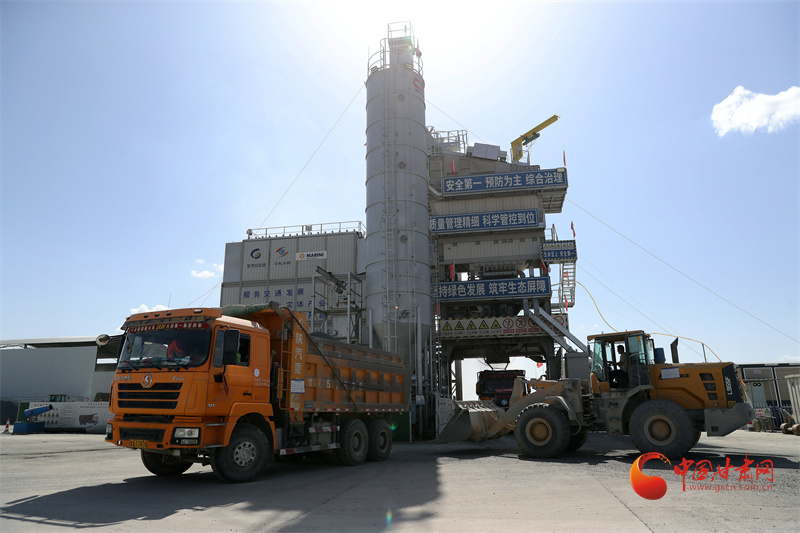 盛夏时节,戈壁热浪滚滚,路面摊铺更加繁忙,沥青拌合站火力全开,保障路面作业。