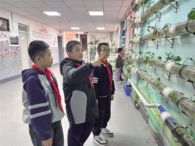 “你们看,这条小金鱼是不是又长大了些!”11月27日清晨课间,兰州市七里河区王家堡小学的走廊里,几名学生正围在一套鱼花共生观察装置前,兴致勃勃地观察水中游动的小鱼。不用翻土、无需换水,在楼道里,鱼儿与植物在循环管道中自然共生——这不仅是校园一景,更是一堂生动的“流动劳动课”。