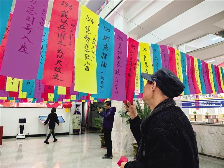 上午9时30分许,记者在活动现场看到,馆内上千条五颜六色的谜笺如彩带般悬挂在空中,谜面内容更是丰富多彩,既有传统的字谜、成语谜,也有紧跟时代的地名谜、科技名词谜,甚至还有不少结合了甘肃本土文化元素的特色谜题,雅俗共赏,市民或三五成群热烈讨论,或独自一人凝神静思,现场气氛十分热烈。