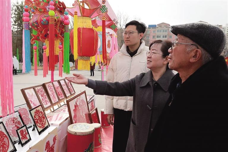 舞台上好戏连台,“非遗集市”同样人气高涨。精美的太平鼓、精巧的铁芯子模型、造型别致的花灯与剪纸,引得群众纷纷驻足,不时拿起手机拍照留影。现场摆放的非遗展板前,工作人员细致讲解,让群众在观赏之余,更读懂背后的历史渊源与匠心技艺。