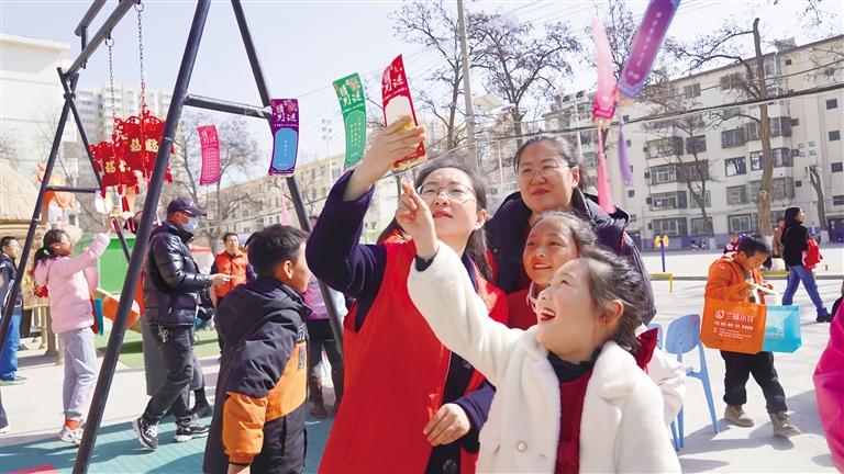 活动现场,数百条灯谜彩带迎风飘扬,居民们驻足凝神、互相探讨,领取精美礼品。此外,社区工作人员与志愿者为居民送上热气腾腾的元宵,大家围坐在一起,品尝着香甜软糯的元宵,分享着节日的喜悦。图为家长和孩子正在猜灯谜。