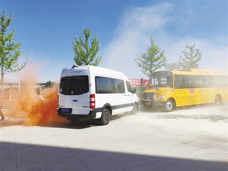 最扣人心弦的当属校车“着火”环节。行驶中的校车突然冒出“浓烟”,司机王师傅立即大喊:“不好!车辆着火了!大家做好准备!”他熟练地将车靠边停下,拉起手刹,关闭引擎,打开危险警示灯,迅速开启应急车门。随车的李老师立刻组织学生并说:“同学们别害怕,捂住口鼻,按照顺序下车!”20名学生用湿纸巾捂住口鼻,弯腰低头,仅用一分钟就全部安全撤离校车。