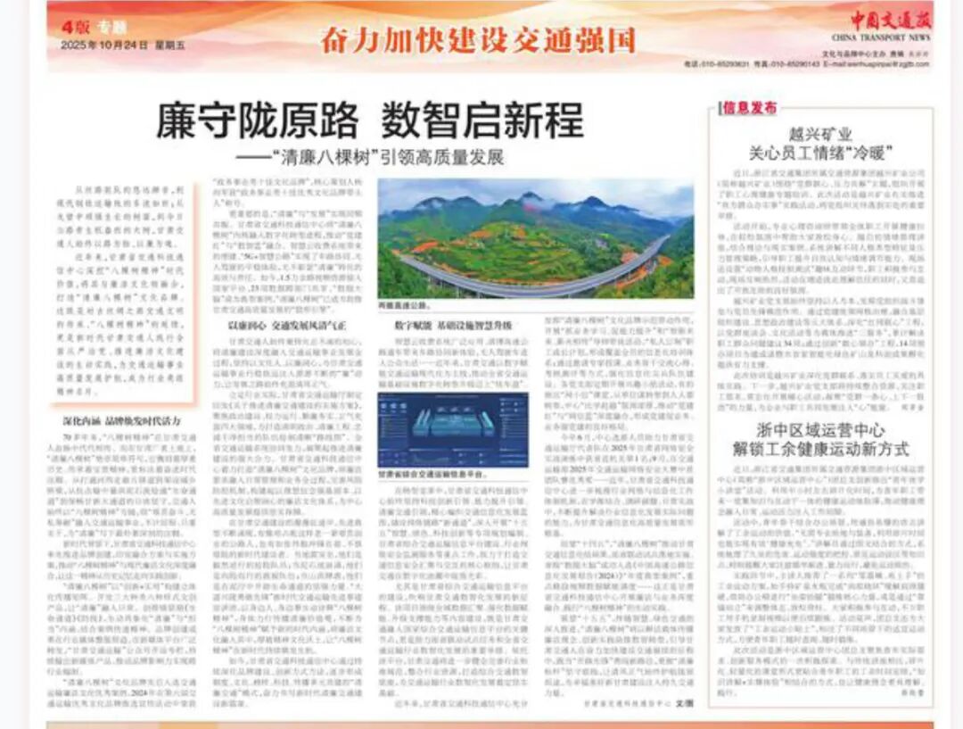 展望“十五五”,伴随智慧、绿色交通的深入推进,“清廉八棵树”将以鲜活载体传播廉洁理念、创新实践助推数智转型,引导甘肃交通人在奋力加快建设交通强国的征程中,既当“开路先锋”勇闯新路径,更做“清廉标杆”坚守底线,让清风正气始终护航陇原坦途,为幸福美好新甘肃建设注入持久交通力量。