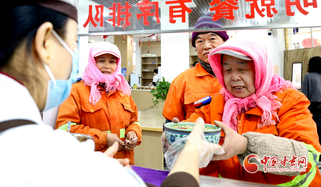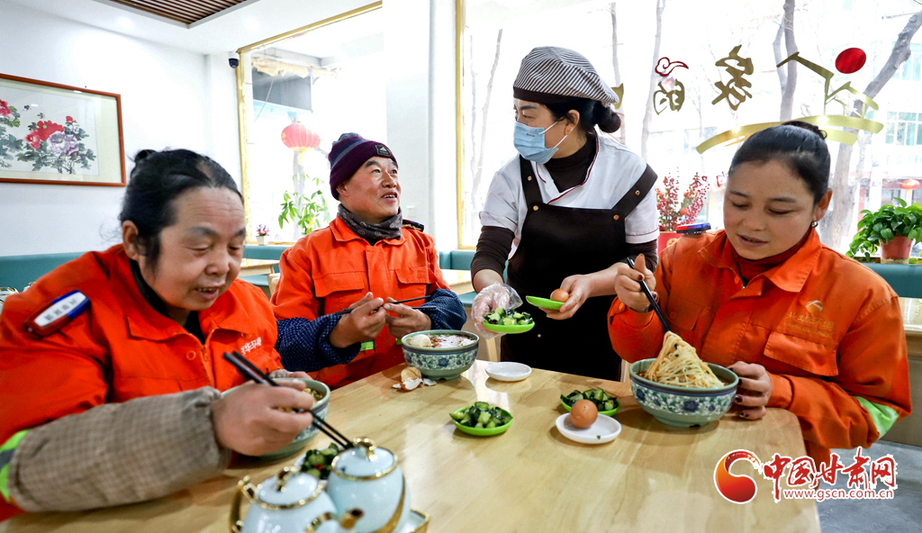 1月29日清晨,张掖市临泽县乐民爱心餐厅内,刚刚结束清扫的环卫工人们围坐在一起,吃着热腾腾的大肉面,劳作的疲惫与清晨的寒意渐渐消散。