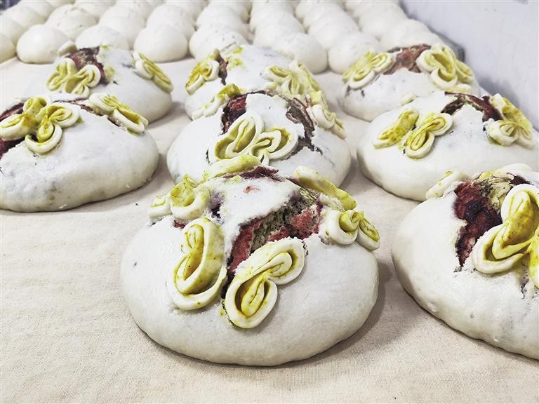 李国军掰开花馍,展示丰富的内馅:玫瑰酱、苦豆粉、姜黄、胡麻籽,“年节花馍不仅馅料讲究,花纹更要喜庆。你看这‘福’字纹、莲花纹,都是手工捏的,许多人过年买,好吃好看又喜庆。”