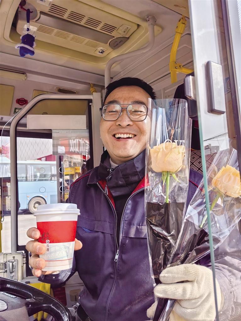公交司机收到暖茶和玫瑰