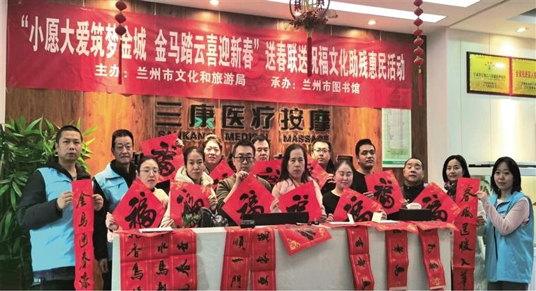 近日,由兰州市文化和旅游局主办、兰州市图书馆承办的“小愿大爱筑梦金城 金马踏云喜迎新春”送春联送祝福文化助残惠民活动走进城关区三康按摩院(武都路店)。此次活动旨在弘扬中华优秀传统文化,积极践行扶残助残的传统美德,让广大残障读者感受春节的喜庆氛围。