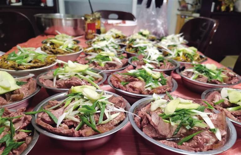 走进金沟乡熊子湾村王芳红家的厨房,一场关于年味的“团聚”比往年来得更早。“这糟肉、麻辣肉啊,必须得用农家喂养的猪肉来做。再配上香气四溢的糟豆腐、南乳汁、葱、姜、蒜苗等佐料,把肉切成宽条煮到七成熟,然后切片装碗,上锅再蒸上30分钟,只有真材实料才能做出正宗的香味!”王芳红一边熟练地摆放着切好的肉,一边念叨着祖辈传下来的讲究。她的双手在碗间灵动起伏,好似在弹奏一首无声而又饱含深情的乡土乐章。从腊月初开始,她就和姐妹们一起忙碌起来,连续做了600多碗各类扣肉。大家都信赖她的手艺,纷纷找她指导。除了留下一部分自家吃,其余的都邮寄给了无法归家的亲人,让他们也能尝尝家乡的味道。